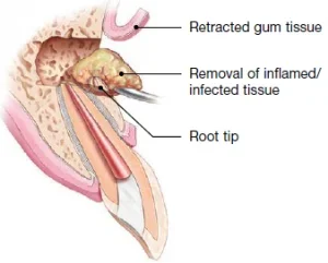 في هذا الإجراء، يقوم اختصاصي المعالجه اللبية بفتح نسيج اللّثَّة ليرى العظم أسفله وَ ليزيل أي نسيج ملتهب أو مُصاب. وتتم إزالة نهاية الجذر أيضًا.