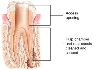 - يقوم إختصاصي علاج العصب بعمل فتحة من خلال تاج السن إلى داخل حجرة اللب. وتستخدم أدوات صغيرة جدًّا لتنظيف أنسجة اللبّ من حجرة اللب والقنوات لتشكيل مساحةٍ للحشوة.