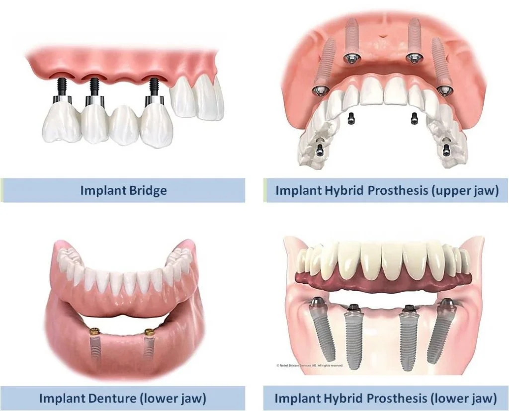 - تعويض الفك الكامل: استخدام عدد قليل من الزرعات (مثل تقنية All-on-4 أو All-on-6) لتثبيت طقم كامل للفك العلوي أو السفلي.